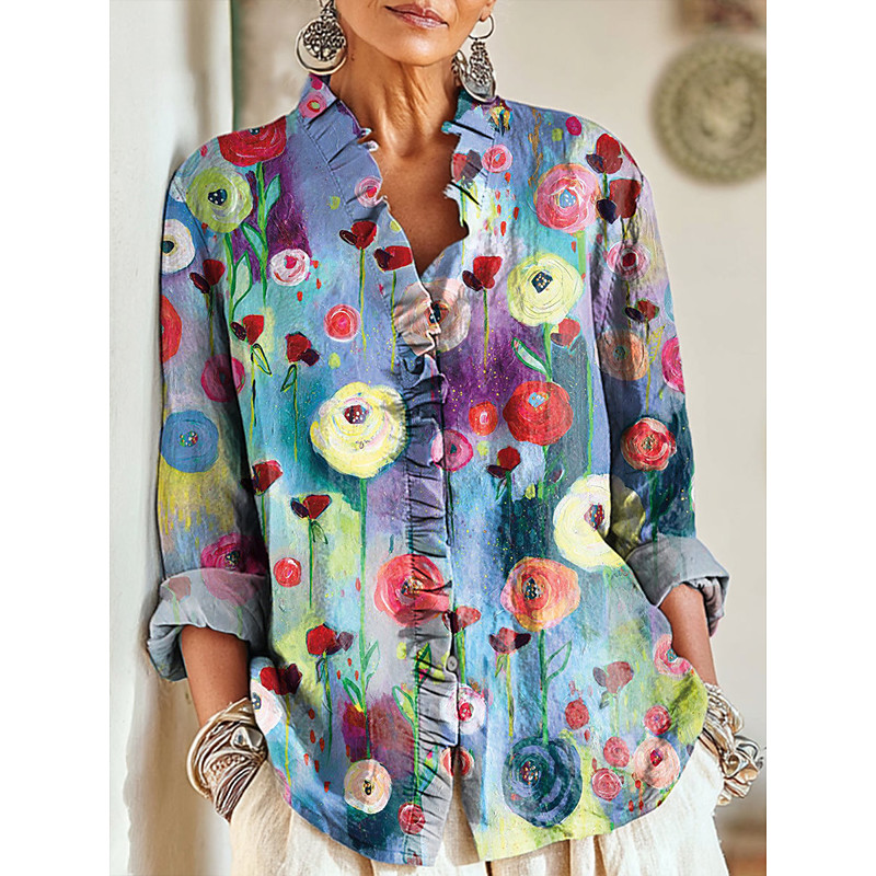 Women's Boho Shirt Floral Graphic Elegant Vintage Daily Long Sleeve V Neck Regular Tops Work Daily Holiday Ruched Ruffle Pink Red Blue Dusty Blue Green Spring Fall