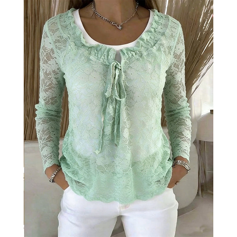 Women's Summer Tops Blouse Dressy Tops Solid Color Floral Elegant Vintage Ladies Long Sleeve V Neck Regular Tops Daily Work Going out Ruched Lace up Lace Black White Light Green Pink Khaki Summer