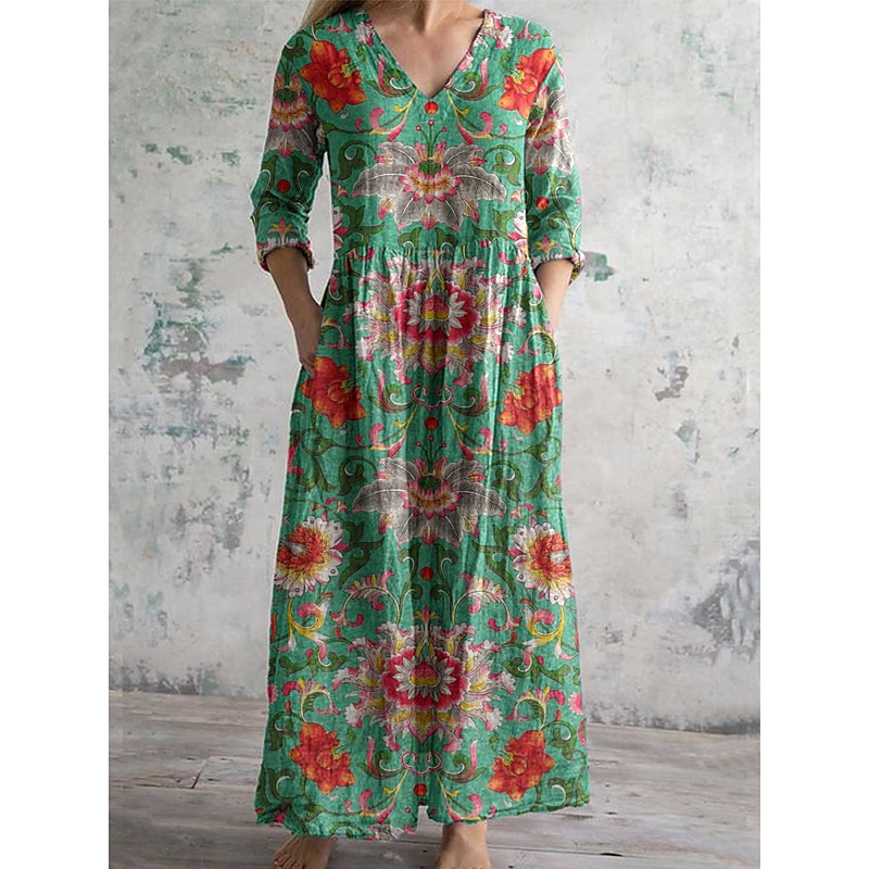 Women's Midi Dress A Line Dress Casual Daily Regular Fit Floral 3/4 Length Sleeve V Neck Yellow Dark Green Brown Green Summer Spring Fall