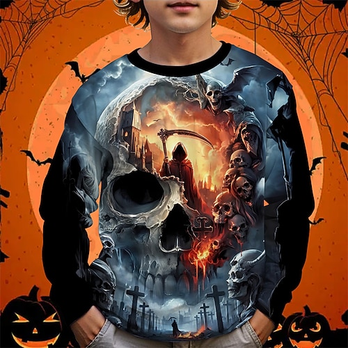 Halloween Jungen 3D Schädel T-Shirt Langarm Frühling Herbst Mode Basic Kinder 4-12 Jahre Rundhalsausschnitt Outdoor Lässig Täglich Normale Passform