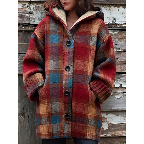 Per donna Cardigan Quotidiano Casual Grafico Plaid A Coste Con Cappuccio Patchwork Tasca Bottoni Manica Lunga Top Regolari Maglia All'aperto Weekend Rosso Autunno Inverno