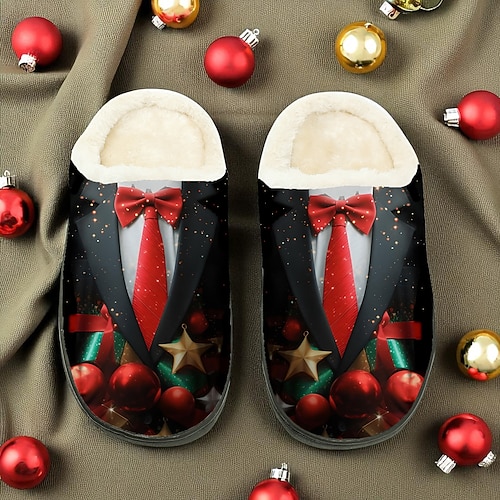 Weihnachtspantoffeln für Herren – festliches Design mit roter Fliege, warme Fleece-Hausschuhe, gemütliche Hausschuhe für Winter und Weihnachten