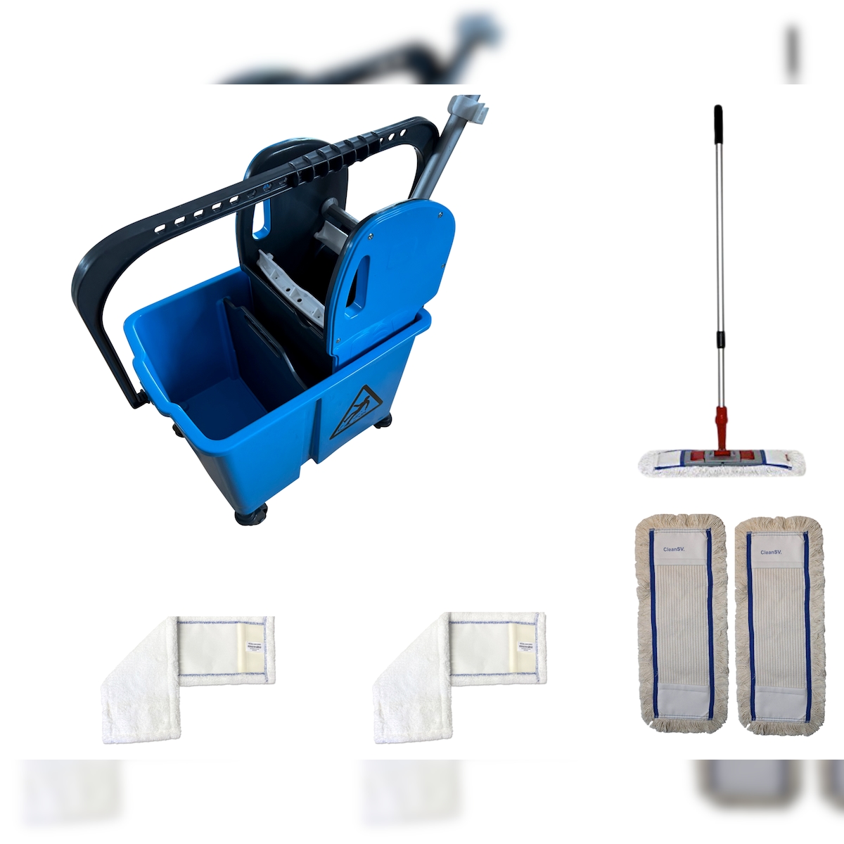 CleanSV Wischset blau 50 cm, Reinigungswagen 1 x 20 Liter Eimer (Teilbar), Presse, 1 Mophalter, 3 x Baumwollmop, 2 Microfasermop Teleskopstiehl