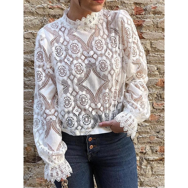 Women's White Elegant Lace Tops Eyelet Blouse Fashion Modern Lace Patchwork Long Sleeve Regular Tops Casual Romantic Petite Tops Summer Holiday Wear Black White