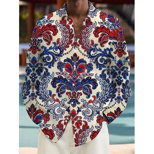 Herren Ethnisch Hemd Knopfhemd Langarm Vintage Tribal Alltagskleidung Ausgehen Wochenende Herbst Winter Stehkragen Druck Button-Down Rote Purpur Orange Grün Khaki