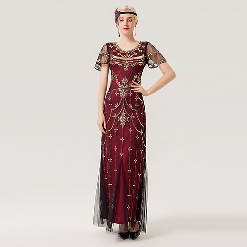 Anni Ruggenti Anni 1920 Abito da cocktail Lunghezza alla caviglia Vestito Abiti Abiti da Ballo Maniche corte Il grande Gatsby Charleston Invitato al matrimonio Piuma Scollo a V Costume Per donna