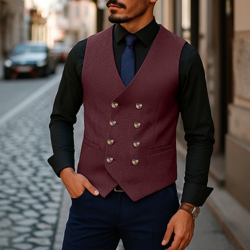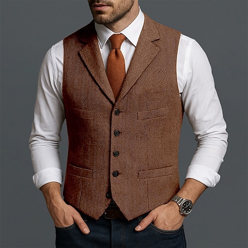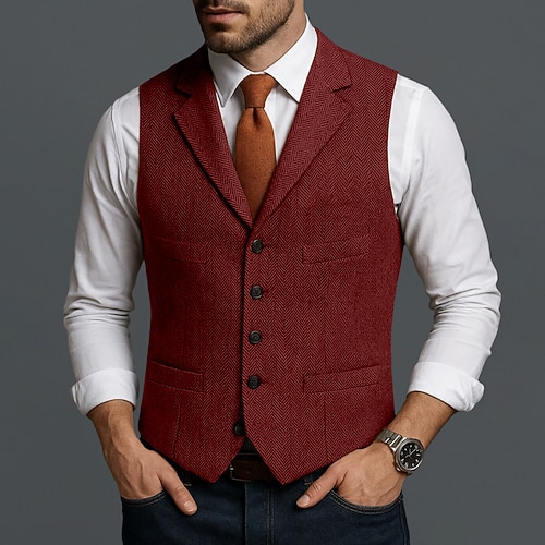 Per uomo Gilet in tweed Gilet Formale Matrimonio Vacanza Affari Punk Vintage Primavera Autunno Tasca Bottoni Poliestere Confortevole Spina di Pesce Monopetto Scollo a V Vestibilità aderente Nero Vino