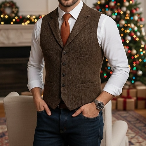 Per uomo Gilet in tweed Gilet Formale Matrimonio Vacanza Casuale Vintage Moda Primavera Autunno Tasca Bottoni Poliestere Tweed Confortevole Semplice Spina di Pesce Monopetto Scollo a V Con intaglio