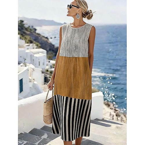 Abito Midi da Donna in Lino Abito da Sole Abito a Shift Vacanza Casuale Spiaggia Uscita Fit Normale Grafico Geometrico Senza Maniche Collo Giro Blu Giallo Rosso Estate Primavera