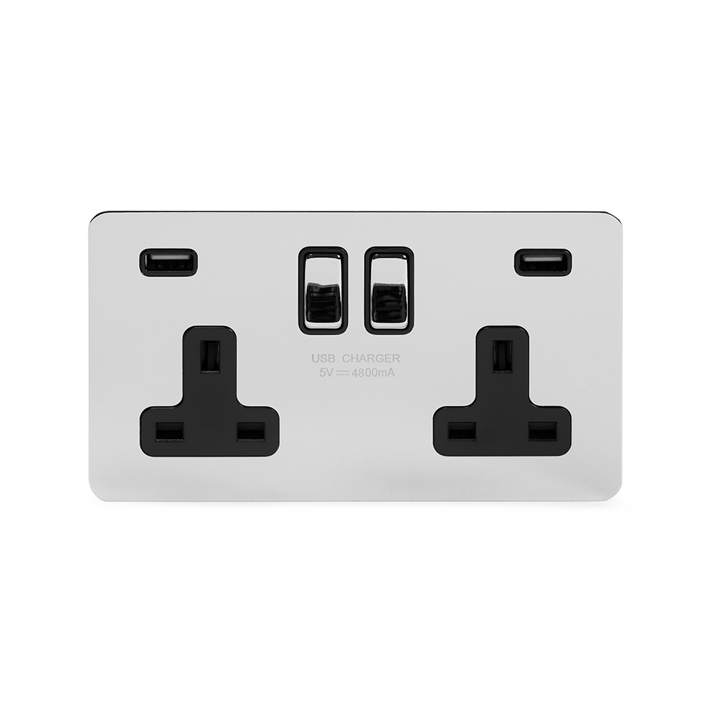 Soho Lighting Polished Chrome Flat Plate 2 Gang 13A DP Socket with 2 x USB-A 4.8A