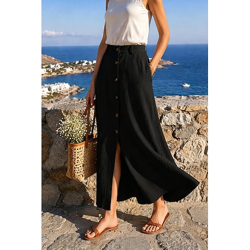 Per donna Gonna da vacanza Gonna in finto cotone e lino Moda stiledella nonnacostiera Casual Estate Maxi Misura del girovita medio Gonne Tinta unita Inelastico Quotidiano Vacanza Nero Bianco Blu