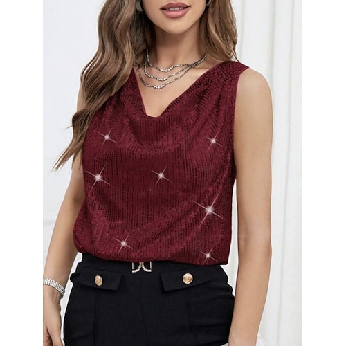 Per donna Blusa Tinta unica Elegante Senza Maniche Scollo a Cascata Top Regolari Quotidiano Ferie Paillettes Drappeggiato Nero Champagne Vino Verde Estate