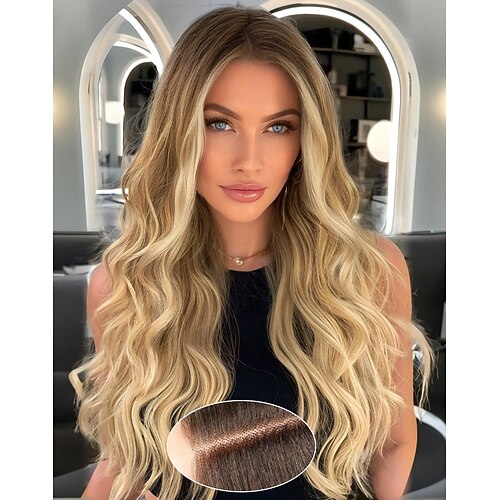 parrucca lunga castana ondulata con mèches, parte centrale, parrucche ricce, parrucche in pizzo con attaccatura dei capelli per donna, parrucche sintetiche resistenti al calore, castane ombré per uso