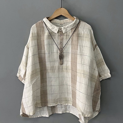 Per donna Camicie di cotone e lino Blusa Plaid Elegante Vintage Manica Corta Girocollo Top Regolari Quotidiano Ferie Uscire Bottoni Nero Beige Estate Primavera