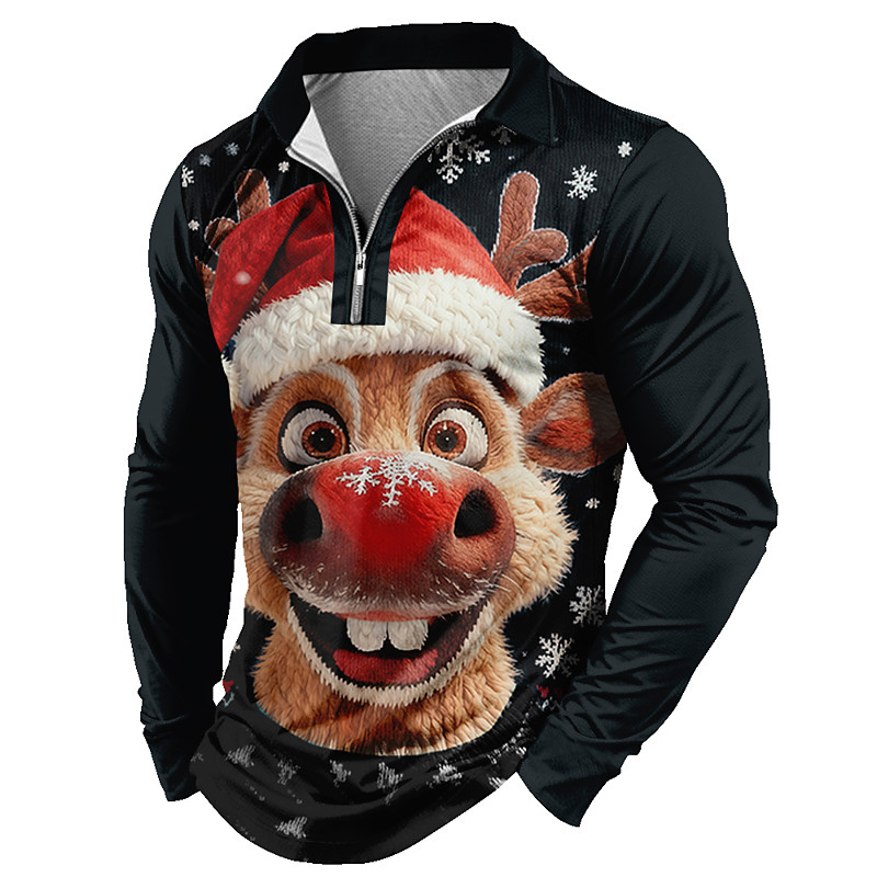 Christmas Men's Elk 3D Cartoon Polo Long Sleeve Polo Shirts Lapel Casual Daily Wear Festival Outfit 3D Print Quarter Zip Polo Spring Fall Winter Blue Black Red