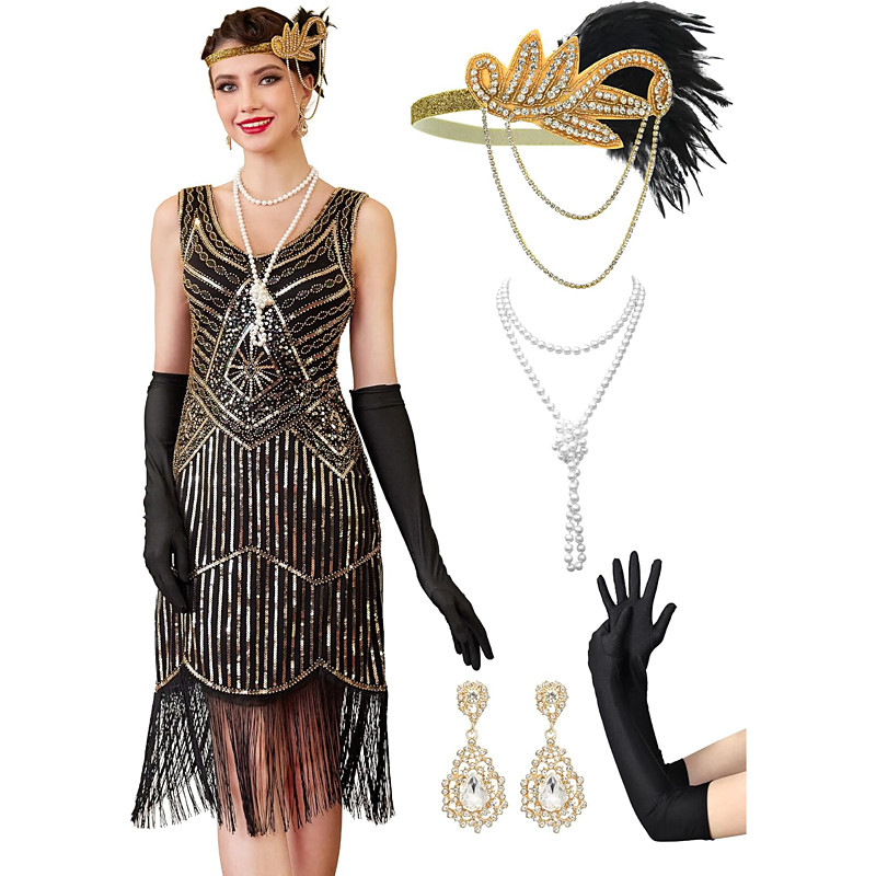 Flapper Dress The Great Gatsby 6 Pcs Retro Vintage Roaring 20s 1920s With Accessories Set Outfits Cocktail Dress Women's Sequins Costume Vintage Cosplay Party Evening Dress