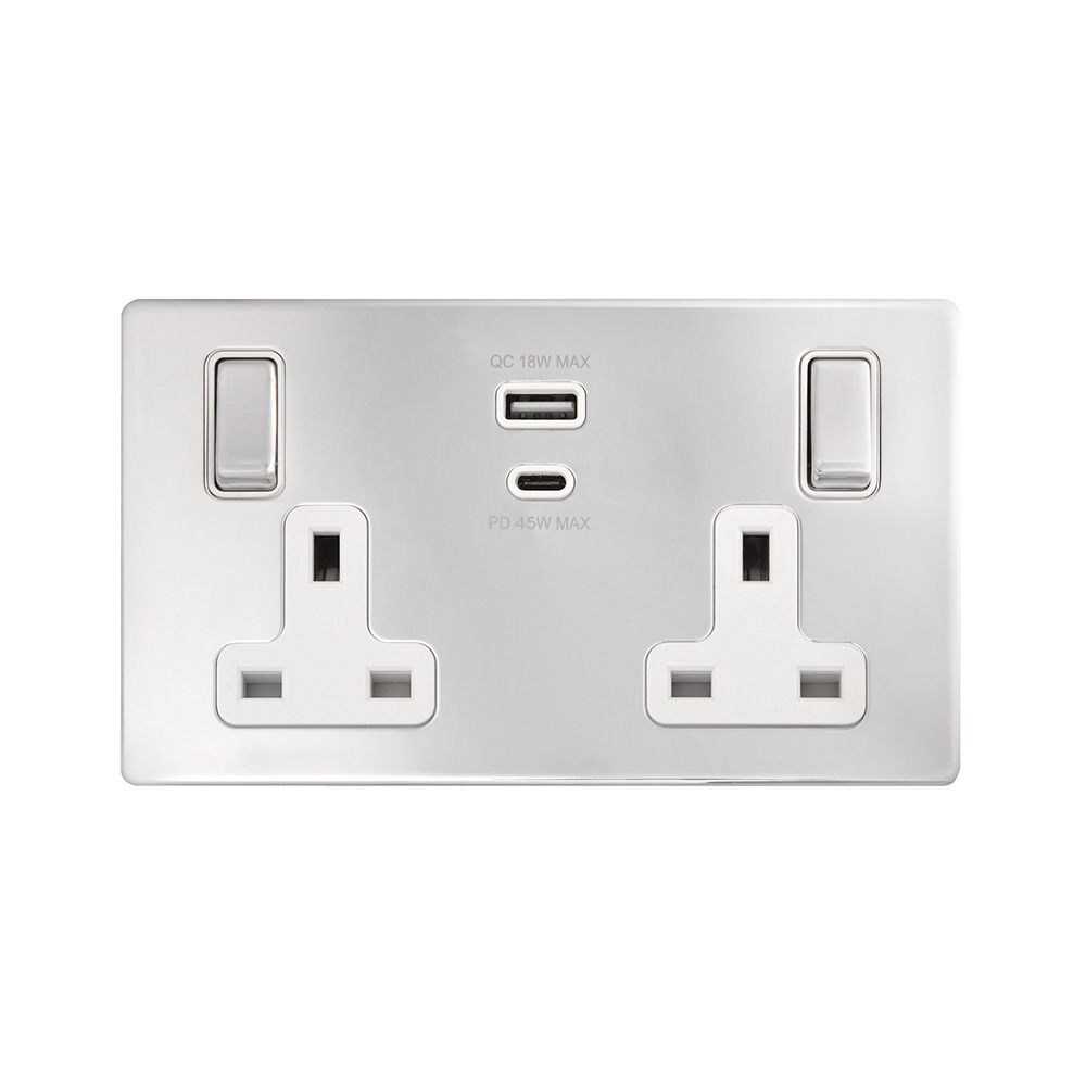 Soho Lighting Polished Chrome with White Insert 13A 2 Gang Super Fast Charge 45W USB A+C Socket