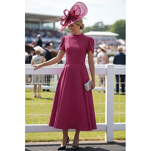 Linea ad A Lunghezza Tè Abito Derby Abito da cerimonia per signora Manica Corta Collo Alto Elegante Vintage Derby del Kentucky Tessuto Elasticizzato con Pieghe Tinta unita