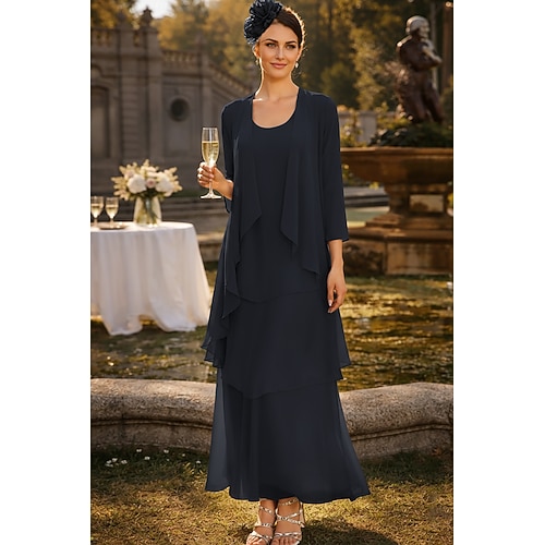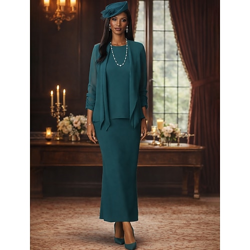 Due Pezzi Tubino Colonna Lunghezza al pavimento Abito da invitata a nozze Abito da cerimonia per signora Manica Lunga Scollo Tondo Elegante Formale Ospite di nozze Chiffon Con Stola con Tinta unita