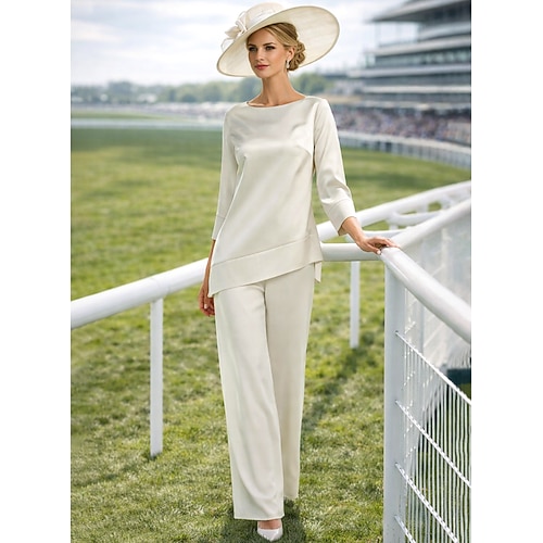 Tuta Completo Pantalone Lunghezza al pavimento Abito da cerimonia per signora Manica 3/4 Collo gioiello Elegante Semplice Minimalista Formale Ospite di nozze Raso Con Stola con Tinta unita