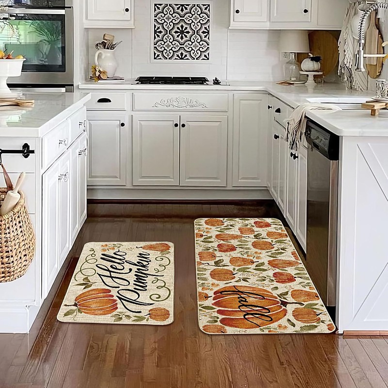 Fall Autumn Pumpkin Linen Mats Set - Absorbent, Oil-Resistant Kitchen Entryway Door Mats, 2-Piece Set For Thanksgiving