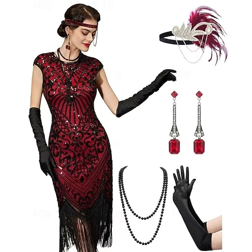 Retrò Vintage Anni Ruggenti Anni 1920 Lunghezza al ginocchio Abito Flapper Abiti Set di accessori Senza maniche Il grande Gatsby Ragazza Flapper Invitato al matrimonio Paillettes Frangia con nappe