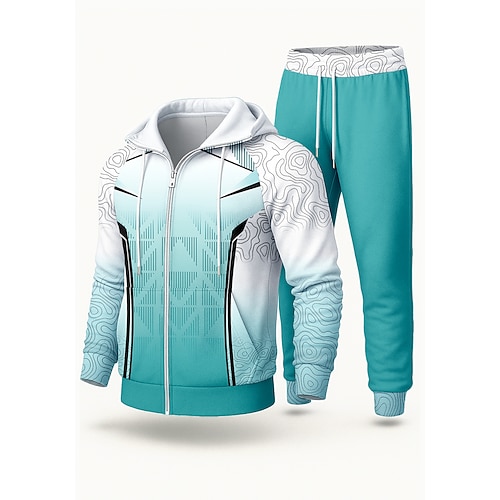 Herren Kapuzensweatshirt Trainingsanzug 2-teiliger Trainingsanzug Kordelzug Reißverschluss Geometrisch Kombination Herbst Blau Berufung Outdoor Reise Leicht Mode Langarm Sport Sportkleidung Dehnbar