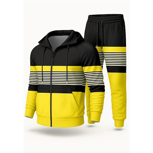 Herren Kapuzensweatshirt Trainingsanzug 2-teiliger Trainingsanzug Kordelzug Reißverschluss Gestreift Kombination Herbst Gelb Berufung Outdoor Reise Leicht Mode Langarm Sport Sportkleidung Dehnbar