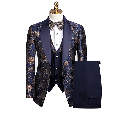 Uomo Feste matrimonio invernale Smoking Bavero sciallato Nero Bianco Moda Festa Jacquard Floreale Vestibilità aderente 3 pezzi Monopetto a un bottone