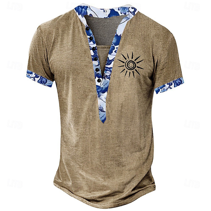 Men's Floral T Shirt Henley Shirt Tee Short Sleeve Designer Basic Ethnic Outdoor Casual Daily Summer Light Green Dark Brown Khaki Henley Henley T-Shirt