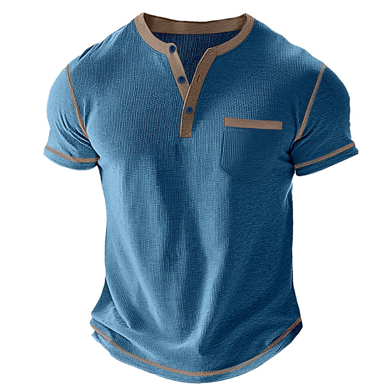 Men's Waffle Knit Tee Tee Top Short Sleeve V Neck Mandarin Collar Summer Spring All Seasons Solid Color Color Block Fashion Designer Casual Buttons Fake two piece Casual Daily Outdoor Light Blue Army