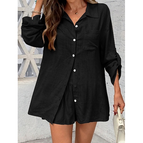 Per donna Set da due pezzi Camicia di cotone Set di Pantaloncini Manica Lunga Colletto a Camicia Semplice Moda Streetwear Casuale Quotidiano All'aperto Nero Blu marino Arancione Estate Vestibilit