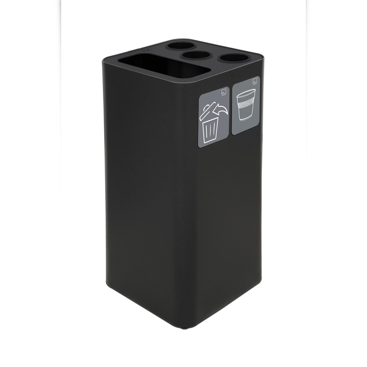 Stil Casa PURE Getränkehalter, lackierter Stahl 38x38x80 cm, 3 Getränkehalterlöcher + Papierkorb, 2 magnetische Piktogramme, 100 L, schwarz.