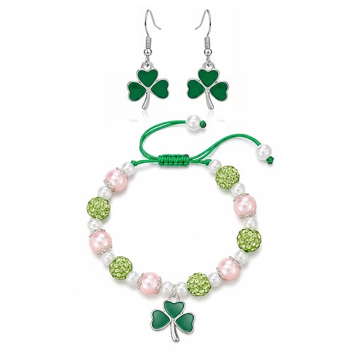 set di bracciale e orecchini da donna in lega e acrilico con trifoglio, perline verdi e bianche, perfetti per il giorno di San Patrizio e per l'uso quotidiano