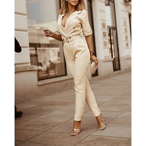 Per donna Tuta Attivo Tinta unica Mezza Manica Scollo a V Tasca Bottoni Vacanza Lavoro Vestibilità regolare Blu Bianco Rosa Primavera