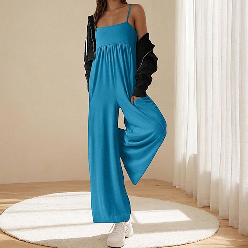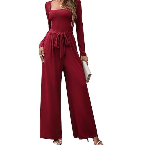 Per donna Tuta Elegante Tinta unica Manica Lunga Gamba larga Collo a U Allacciato Vacanza Casa Vestibilità regolare Blu Nero Rosa Estate