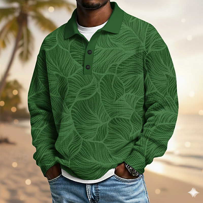 Men's Leaf Plants Waffle Polo Shirts Long Sleeve Polo Shirts Lapel Casual Resort Athleisure Hawaiian Daily Wear 3D Print Spring Fall Winter Blue Purple Green