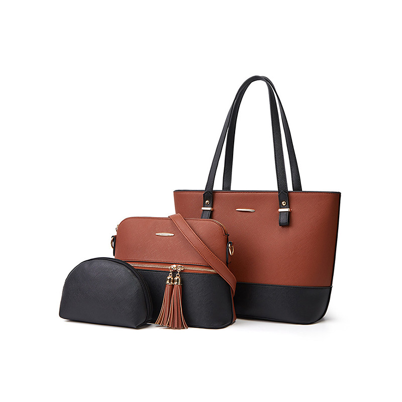 Elegant women's stylish two-tone patchwork handbag set with tassel decoration - handbag, crossbody bag and small bag - perfect for daily leisure, commuting to work