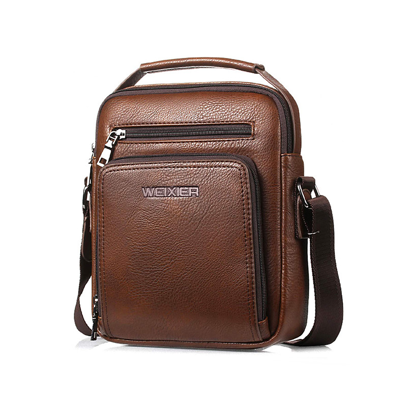 Men's Brown Black Faux Leather Crossbody Messenger Bag with Multiple Zipper Compartments for Business Travel and Daily Office Use