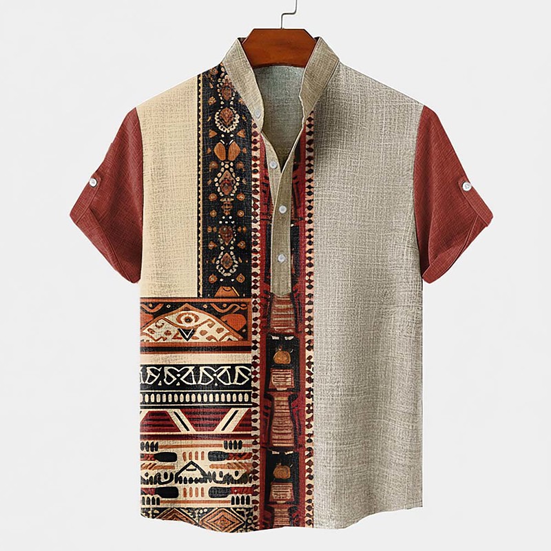 Men's Color Block Tribal Ethic / African Shirt Button Down Shirt Short Sleeve Vintage Retro Holiday Casual Daily Summer Spring Standing Collar Henley Collar 3D Print Linen Like Shirt Black Khaki