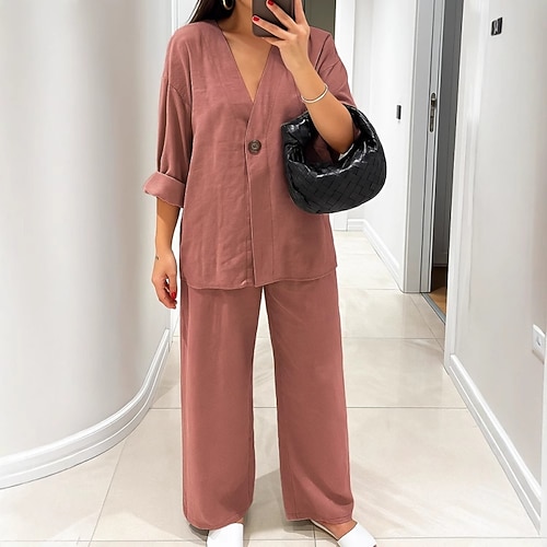 Per donna Moda Streetwear Camicia Set di biancheria in cotone Set da due pezzi Pantaloni di Lino Pantaloni Manica Lunga Scollo a V Tinta unica Ferie Abbigliamento quotidiano Nero Bianco Blu marino