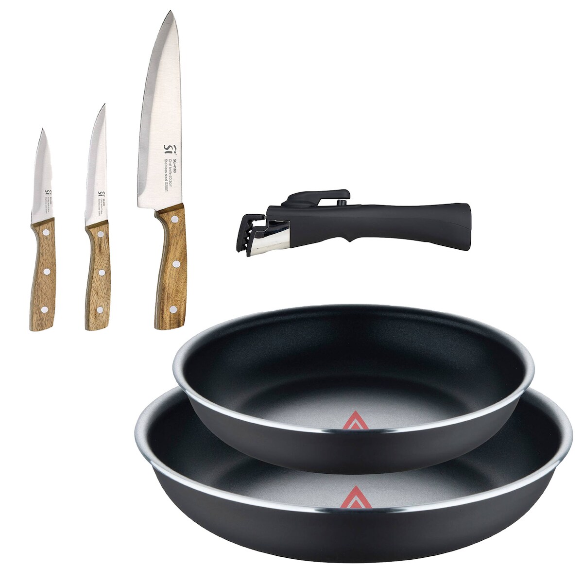 BERGNER - Set aus 2 Pfannen Ø22/26 cm gepresstes Aluminium Schwarz mit abnehmbarem Griff mit Set aus 3 Küchenmessern Edelstahl