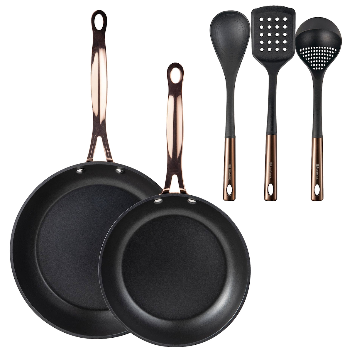 BERGNER - Set aus 2 Pfannen Ø20/24 cm aus geschmiedetem Aluminium Schwarz Matt mit Set aus 3 Küchenutensilien PBT Schwarz und Kupfer