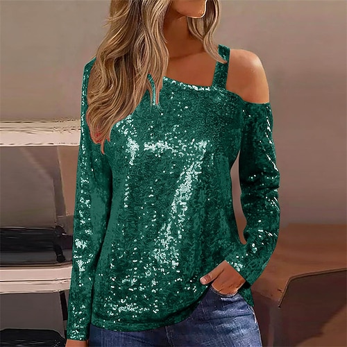Per donna Blusa Top Eleganti Top con paillettes Tinta unica Semplice Elegante Vintage Classico Manica Lunga Asimmetrico Top Regolari Quotidiano Lavoro Uscire Arricciato Paillettes Patchwork Blu Nero