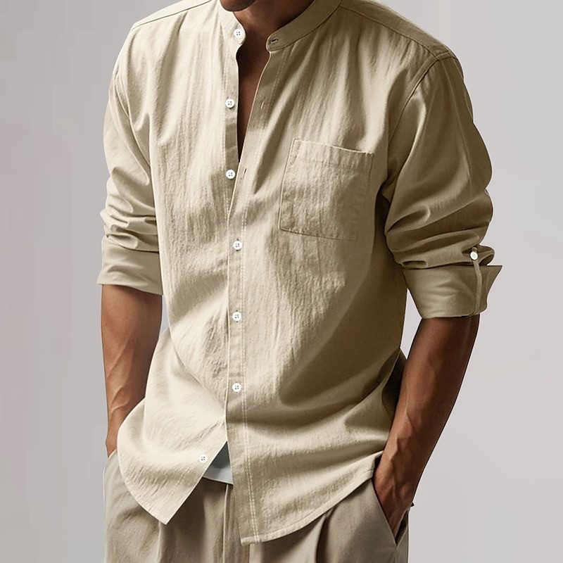 Men's Cotton Linen Shirt Plain Vacation Black White Khaki Dark Gray Long Sleeve Grandad Collar Clothing Apparel Pocket