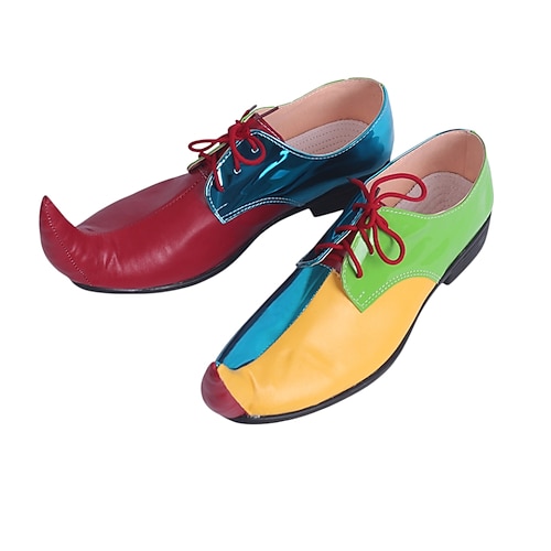 scarpe da clown colorate da uomo con pannelli multicolori e lacci rossi, divertenti stile giocoso per costumi di carnevale e da clown