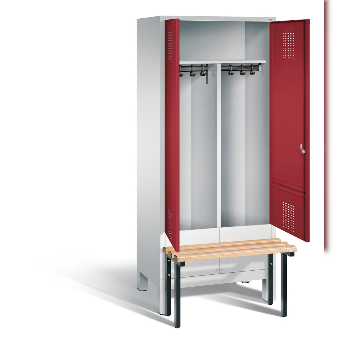 C+P Schwarz-Weiß-Spind Classic PLUS Sitzbank, schmal, 2 Abteile, verkürzte Trennwand mittig, lichtgrau / grau, B 800 mm, Zylinderschloss, auskragend,