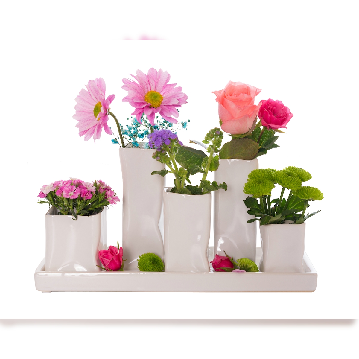 H&D Manufaktur Jinfa Handgefertigte kleine Keramik Deko Blumenvasen Set aus 5 Vasen in weiß auf einem Tablett