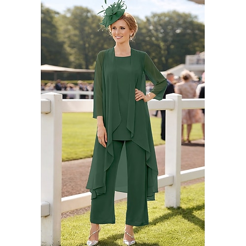 Tuta Completo Pantalone Tre Pezzi Lunghezza alla caviglia Abito da cerimonia per signora Manica Lunga Scollo Tondo Elegante Vintage Ospite di nozze Chiffon Con Stola con Volant Tinta unita