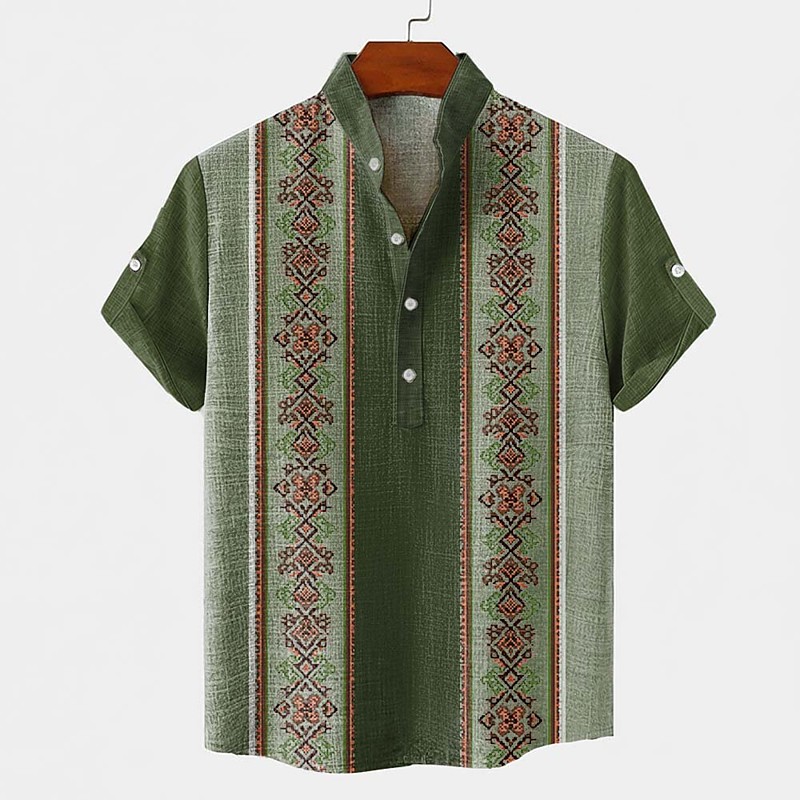 Men's Boardmasters Geometric Pattern Tribal Shirt Button Down Shirt Short Sleeve Vintage Retro Holiday Casual Daily Summer Spring Standing Collar Henley Collar 3D Print Linen Like Shirt Brown Green
